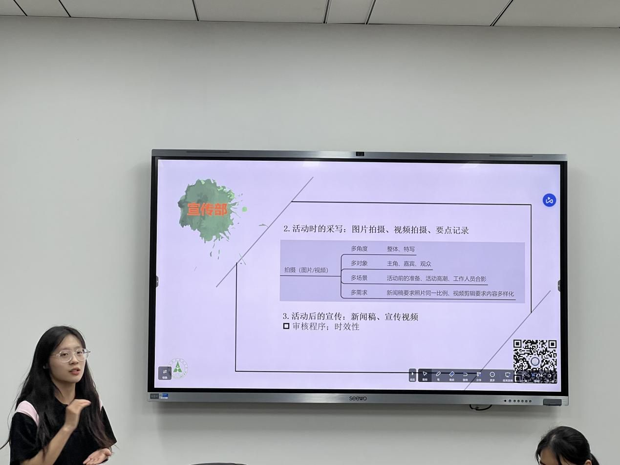 接下来,法学院22级团总支的三名骨干分别进行了工作经验分享。实践部成员着重介绍了如何有效开展对外联络和对内建设以丰富团总支的活动形式和内容;策划部成员分享了如何创新地捕捉同学需求,结合学科特点开展有针对性的活动,以及如何统筹活动的策划和实施;宣传部成员则详细讲解了团总支工作中海报、视频制作的规范性以及新闻稿撰写的时效性,为统数学院团总支提供了宝贵的宣传经验。