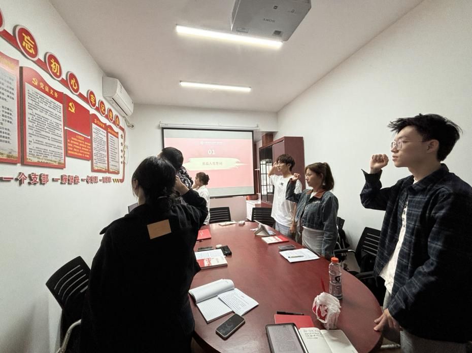 活动开始,党支部成员陈智睿带领2022级本科生党支部成员重温入党誓词。面对鲜红的党旗和庄严的誓词,共同高举右拳,庄严宣誓。铿锵有力的宣誓,表达了大家对党的无限忠诚和热爱,以及坚定不移听党话、跟党走的坚定决心。