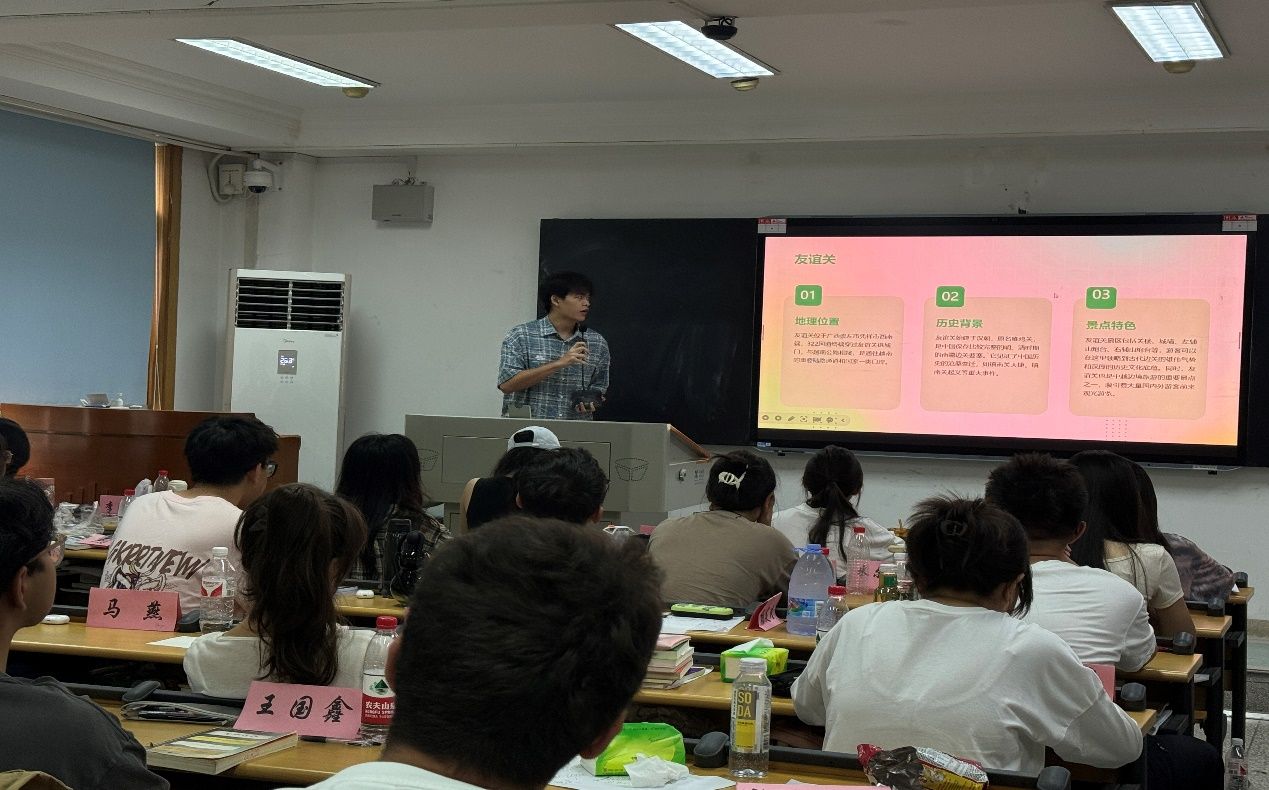 凌鑫攀同学为我们介绍了他的他家乡——崇左市。崇左市位于中国广西壮族自治区西南部,是一个充满魅力的地方,因为它悠久的历史文化和丰富的自然景观。首先,凌鑫攀同学向我们介绍了崇左市的人文历史。接着,凌鑫潘同学带领我们领略了崇左市的自然风光如德天瀑布,龙州地下河等。最后,凌鑫攀同学还分享了几道崇左特色美食:壮族五色饭,糯米糍粑等。凌鑫攀同学的精彩介绍,让同学们感受到了这座城市的独特魅力。这次分享不仅让我们增长了知识,也让我们加深了对崇左市的了解。