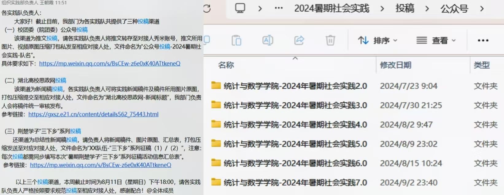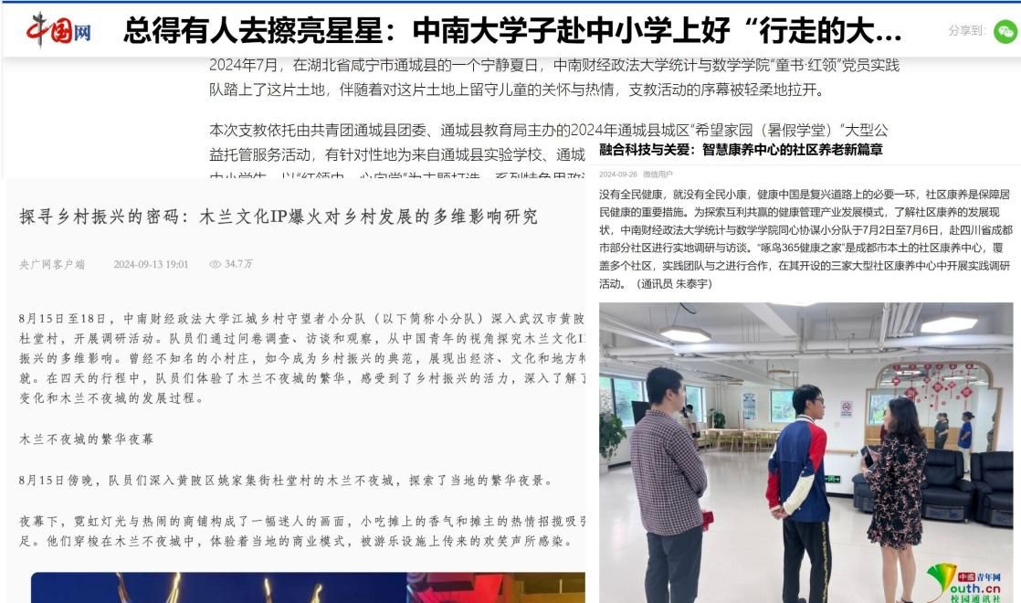 在此过程中,永利官网积极响应校团委的号召,每周汇总实践队的宣传稿件并向校团委宣传中心、荆楚学子及湖北高校思政网等平台进行投稿,收集优秀成果并扩大成果影响范围。同时永利官网团委开展中期考核及结项评优工作,各队伍以提交宣传推文、实践日志、“三下乡”系列网站及其他校外媒体平台投稿情况等方式来展示已有成果。